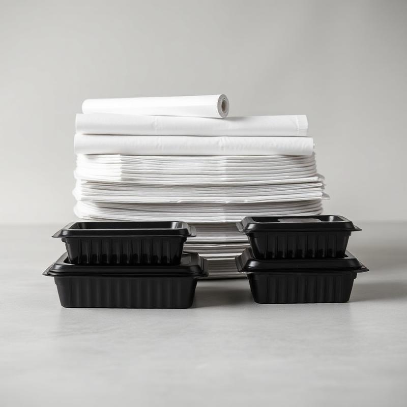 Aluminium foil, cling film, takeaway containers and paper goods — pallet pricing on request.